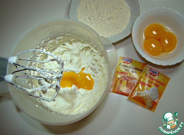 пудрой, добавить по одному желтки, не переставая взбивать.