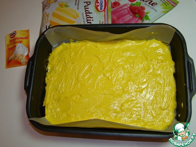 Форму застелить бумагой для выпечки, положить готовый 1 корж из теста № 1. Сверху распределить творожную массу.
