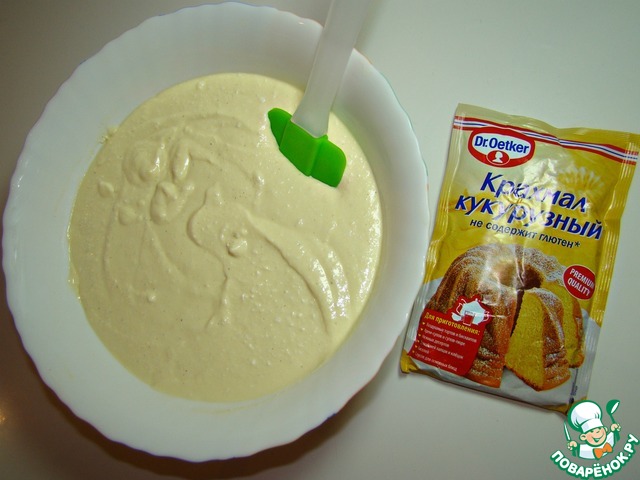 Белки взбить в крепкую пену. Добавлять частями к творожной массе и аккуратно лопаткой перемешать. Для плотности творожной массы я добавила столовую ложку кукурузного крахмала.