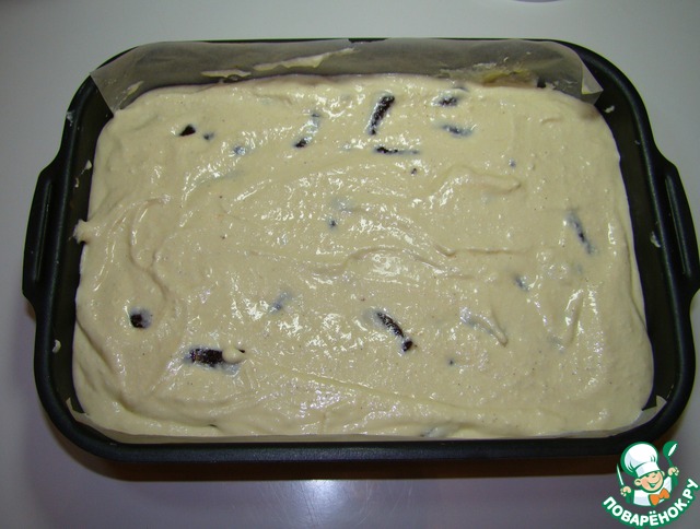 Или кусочки темного теста аккуратно перемешать с творожной массой и вылить поверх коржа из теста № 1.