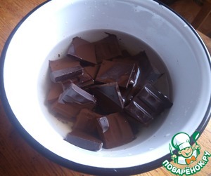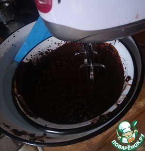 Теперь готовим миксер, готовим большую миску, наливаем в нее холодную воду, хорошо добавить лед. Я клала хладоэлемент от сумки-холодильника. Приготовили? Теперь ставим наш шоколад на плиту на маленький огонь. Ничего не должно кипеть, только плавиться! Так что постоянно помешиваем ложкой. Добиваемся полного растворения шоколада и выключаем, пока не закипело. Немного горячего шоколада я отлила с кружку для пропитки коржей. Теперь ставим кастрюлю в миску с холодной водой и включаем миксер. Начинаем взбивать, постепенно увеличивая скорость.