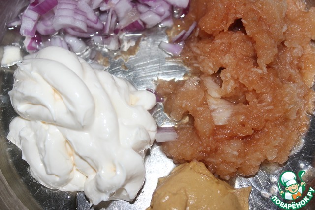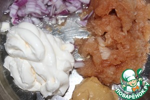 Добавить майонез, горчицу, мелко нарезанный лук, соль, перец, растительное масло. Все перемешать. -