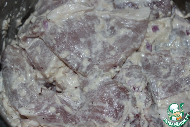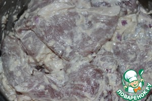 Нарезанное средними кусочками мясо выложить в маринад, перемешать и оставить на два часа в холодильнике.