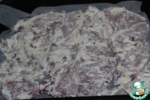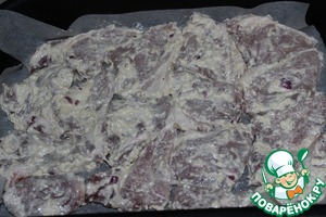 Через указанное время достаем мясо. Выкладываем в форму на пергамент (пергамент можно слегка смазать растительным маслом). Оставшийся маринад выложить на мясо.