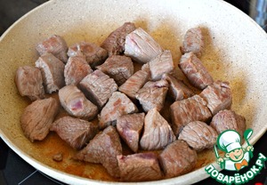 Говяжью мякоть нарезать на кусочки среднего размера (примерно 3х3 см)