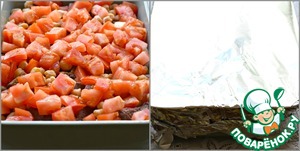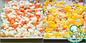 В подходящую форму для запекания выложить нарезанные кубиками лук и морковь.