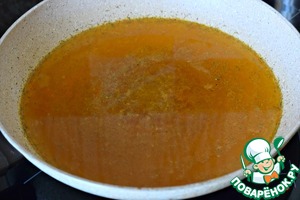 В сковороду, в которой жарилось мясо, налить 300 мл горячей воды, посолить, добавить специи. Используйте ваши любимые приправы. Сочетание чабер, сумах, паприка и молотый кориандр кажется мне очень удачным. По щепотке каждой специи будет достаточно.