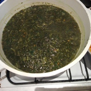 • Ставим закипать воду, литра 2, как только вода закипит, загружаем в кастрюлю шпинат и щавель. Их должно быть 1:1 по объему. У меня щавель свой, поэтому я ориентируюсь не на вес, а на объем. Минут через 5 после закипания добавляем произвольно нарубленную зелень (без стебельков),