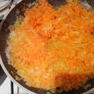 • Готовим овощи для пассировки: лук режем мелким кубиком и отправляем на сковородку, морковку трем на мелкую терку, слегка обжариваем, подсаливаем, приперчиваем (по желанию), доводим до готовности.