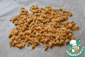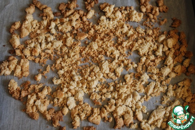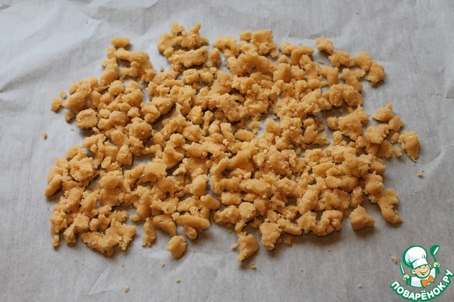 Начнем со штрейзеля. Сливочное масло, два вида муки (ее лучше просеять), сахар и корицу перетираем руками. Распределяем крошку по пергаменту и кладем в морозилку на 10 минут.