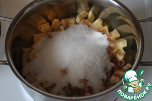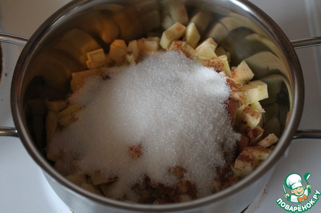 Займемся яблоками. Чистим их, нарезаем некрупными кубиками, кладем в кастрюльку и засыпаем сахаром. Добавляем корицу и сливочное масло.