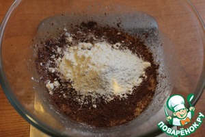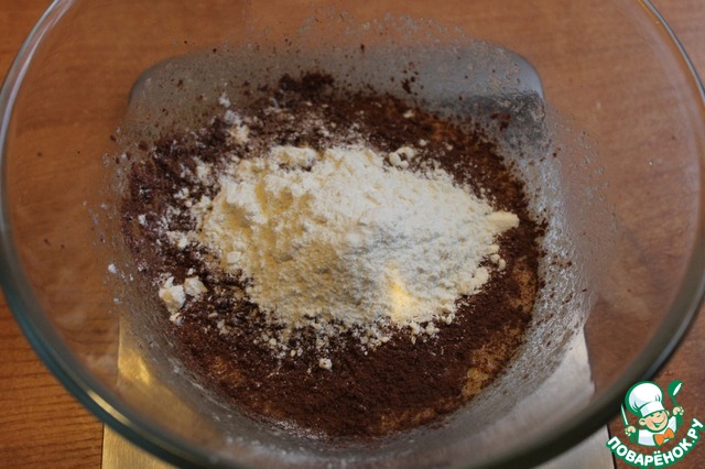 Испечем шоколадный бисквит. Разотрем масло с сахаром, добавим яйцо и взобьем миксером до однородной массы. Просеиваем муку и какао, снова перемешиваем миксером.