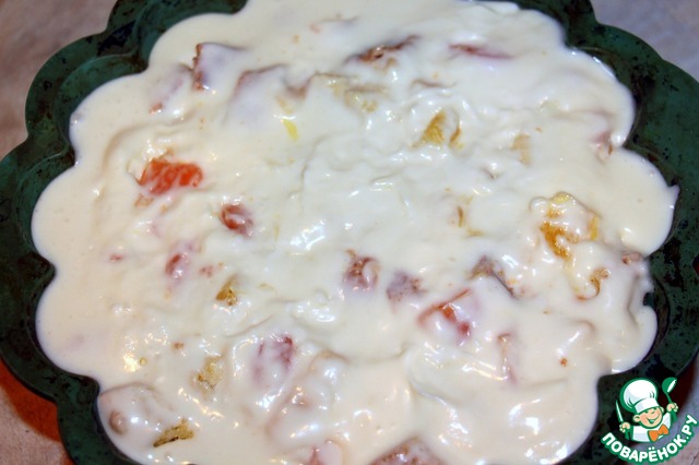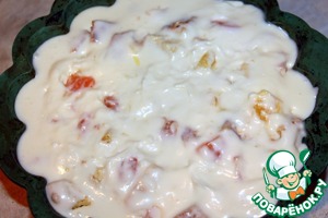 На дно формы вылить половину крема, утопить в нем половину нарезанного бисквита и нарезанных фруктов, затем- опять крем и бисквит с фруктами. Убрать в холодильник для стабилизации на ночь.