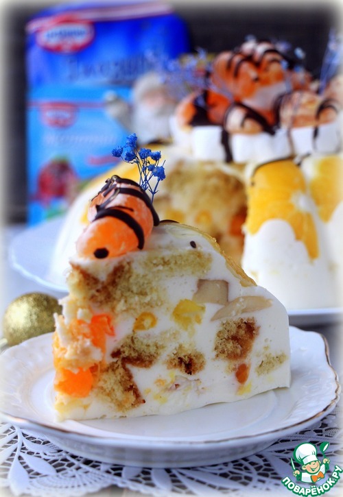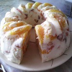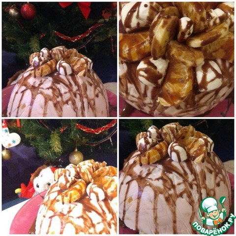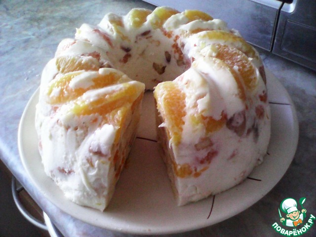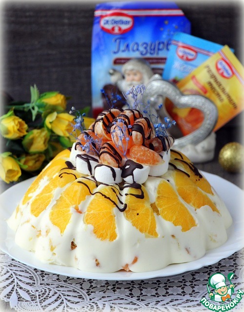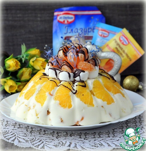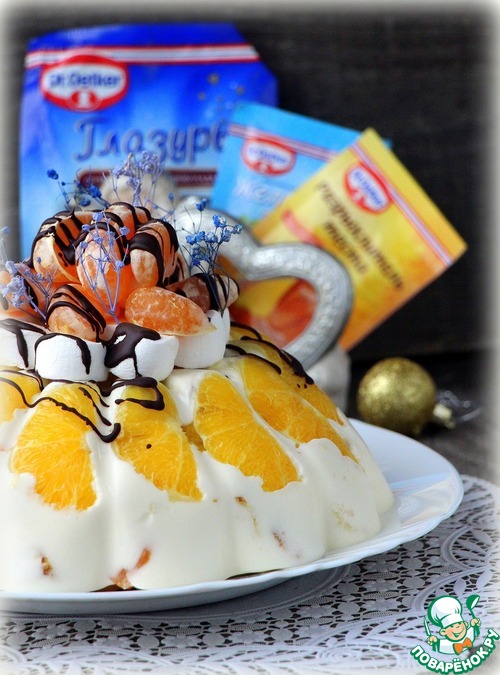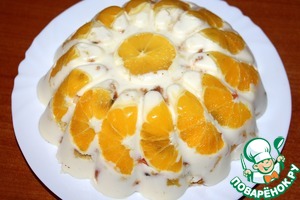 [+5]Из замен: сок ягодный,формы для пудинга нет у меня,взяла стеклянный глубокий салатник,простелила пищевой плёнкой, всё извлекалось потом легко , глазурь была белая со вкусом миндаля,к ней добавила какао))) Дольки апельсина утонули,не удержались на пленке,смыло кремом