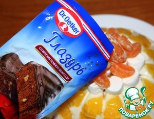 Украсить верхушку маршмеллоу и дольками мандарина. Пакет с Глазурью со вкусом темного шоколада ТМ Dr. Oеtker опустить в миску с горячей водой, и оставить пока глазурь не расплавится. Полить торт расплавленной глазурью.