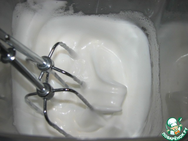 Белки взбить до крепкой пены, затем ввести сахар и взбить до пиков.