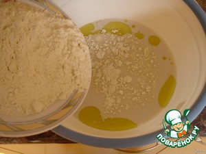 К дрожжам подлить кипячёную воду. Вода должна быть не тёплой, но и не кипятком. Размешать вилкой. Добавить соль, сахар и оливковое масло.