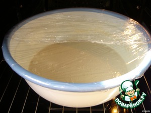 Накрыть тесто плотно пищевой плёнкой. Поставить в тёплое место на 30 минут. Я ставлю в тёплую духовку. Тесто увеличится в 3-4 раза.