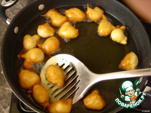 Лукумадес постоянно переворачивайте. Жарьте до тёмно-золотистого цвета.