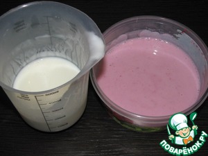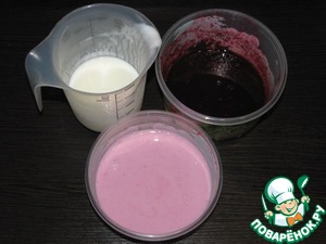 Йогурт разделить на 2 части. В одну часть ввести несколько столовых ложек ягодной смеси, перемешать.