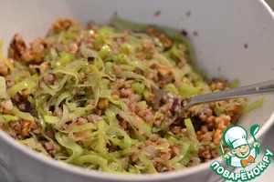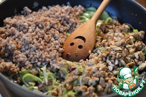 Добавить грецкие орехи и гречку. Перемешать и снять с огня.