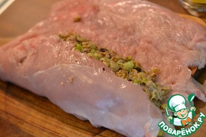 На мясо, по длине, выкладываем начинку.