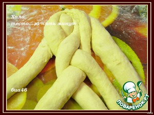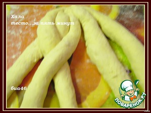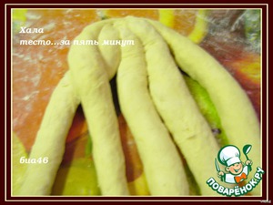 Присыпать стол и тесто мукой, обмакнув руки в муку, оторвать 1/2 часть теста и выложить ее на стол. Аккуратно сформировать из теста колбаску и порезать на пять частей (хала из пяти прядей).