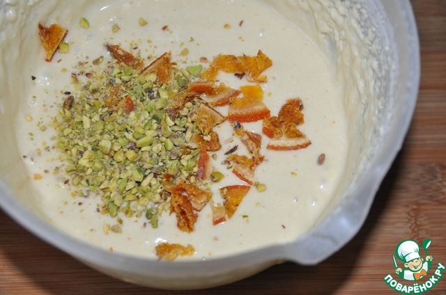 Добавляем поломанный на кусочки карамелизированный апельсин и дробленные фисташки.
