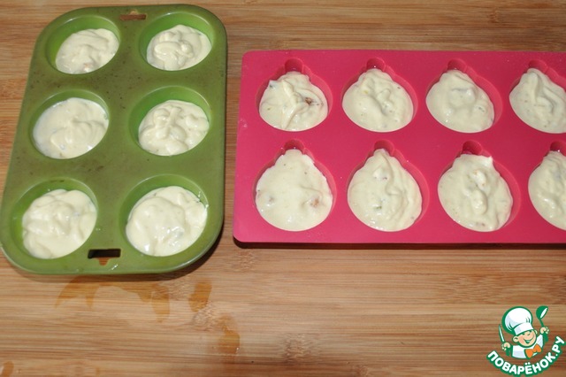 Берём формочки для кексиков, лучше силиконовые, наполняем их на 2/3 тестом, ставим в нагретую до 200 градусов духовку и выпекаем до золотистости 30 минут.
