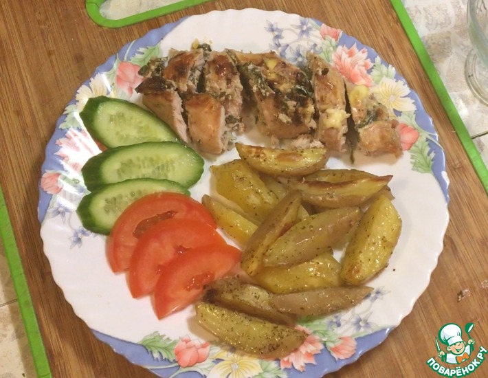 Гарнир можно готовить любой. У меня картофель запеченый с орегано.