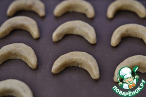Отщипывать от теста маленькие кусочки (чем меньше, тем лучше), лепить рогалики, выкладывать на противень. Выпекать при 180 гр 10 минут. Печенье должно остаться светлым.