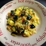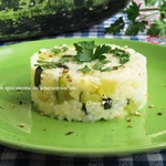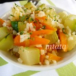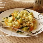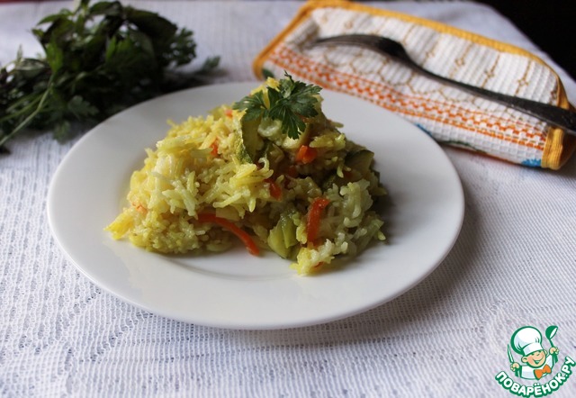 В глубокую посуду уложить слой риса, поверх него - слой кабачков с луком, зелень и перец с солью,