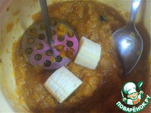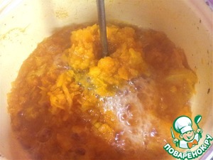 Когда тыква станет помягче (через минут 5-7) прямо в кастрюльке растолочь толкушкой.