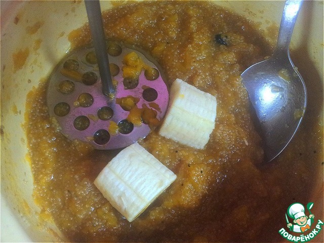 После того, как каша сварилась, выключаем огонь. Чистим банан, отправляем в кастрюлю с кашей и также разминаем толкушкой. Конечно, можно предварительно перебить его в блендере, но я люблю, чтобы чувствовались кусочки. Также на этом этапе я добавила изюм.