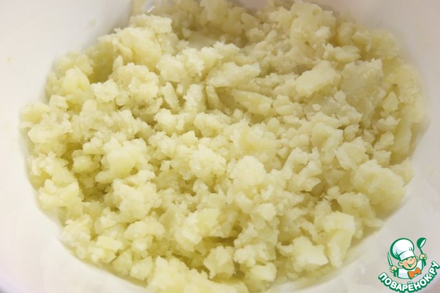 • Картофель очищаем, отвариваем в подсоленной воде до готовности. Горячий картофель мнем в пюре и оставляем остывать.