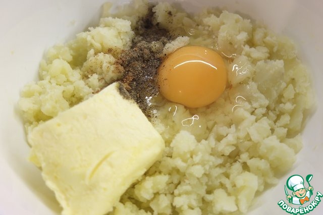 • В остывший картофель добавляем сливочное масло комнатной температуры, яйцо, соль, перец, мускатный орех.