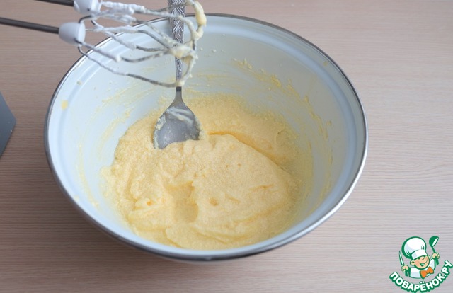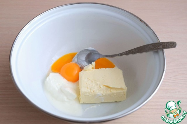 В миску добавить размягченное сливочное масло (100 гр.), яичные желтки (2 шт.), сметану (1 ст. ложка).