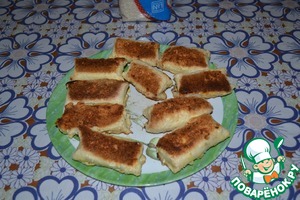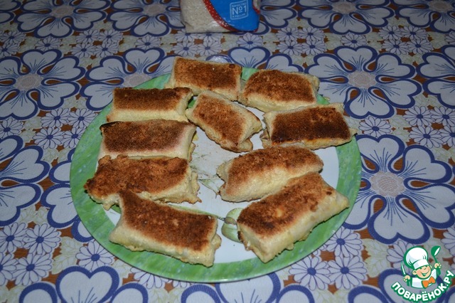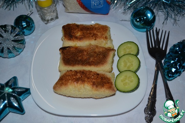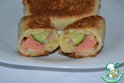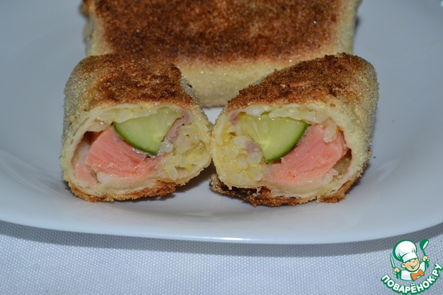 Сплошное удовольствие! Удивительное сочетание продуктов в этой закуске, просто сводит с ума! Ломтик малосольной сёмги, брусочек свежего огурца, пикантный рис с нежным сыром…всё это завёрнуто в тонкий лист лаваша, да ещё и поджаренный до золотистой хрустящей корочки – настоящий праздник вкуса!