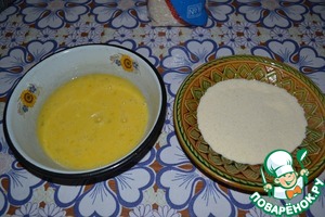 В плоскую тарелку насыпать манку. В отдельной посуде взбить вилкой яйца со щепоткой соли.
