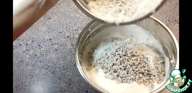 В отдельной миске смешаем 150 грамм сахара 45 грамм муки и 150 грамм очищенных семечек подсолнуха. Объединим ингредиенты с помощью венчика.