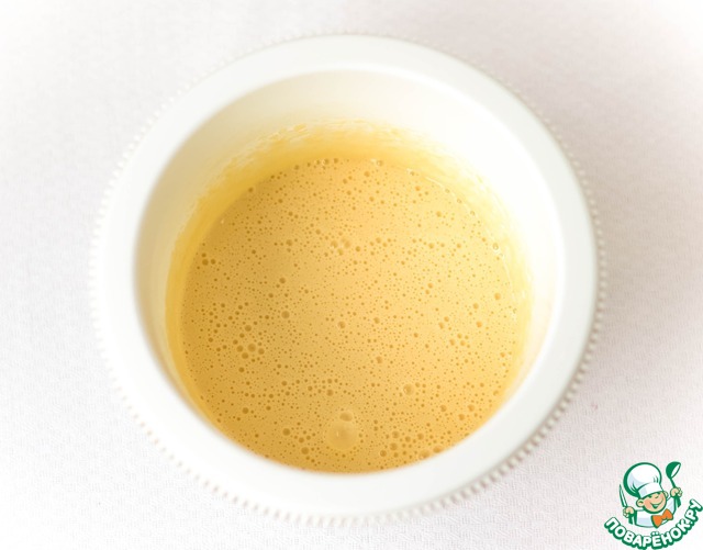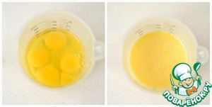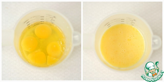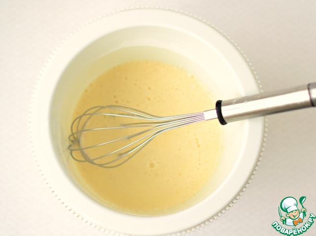 Яйца соединить со 100 мл молока. Взбить венчиком. Добавить крахмал, хорошо перемешать венчиком до однородности массы. -