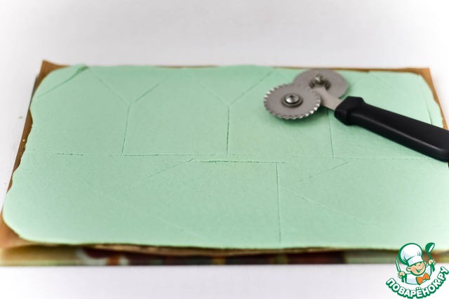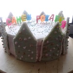 С помощью шаблона вырезать детали короны - 6 шт.. У меня торт получился в диаметре 21 см, высота 8 см. Верхний треугольник не делайте высоким, иначе он будет прогибаться.