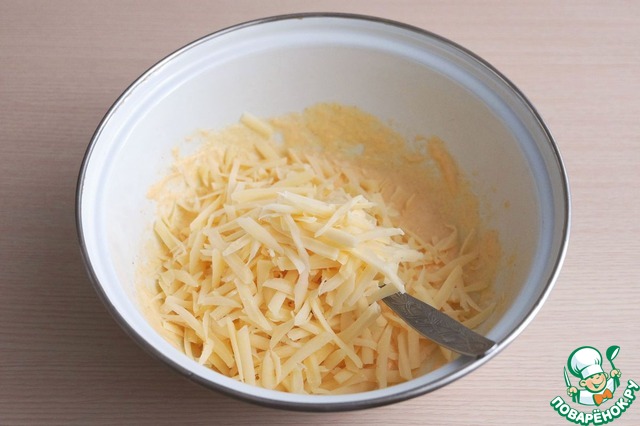 Сыр (150 гр.) натереть на терке. Добавить сырную соломку в подготовленную смесь.