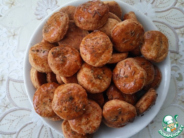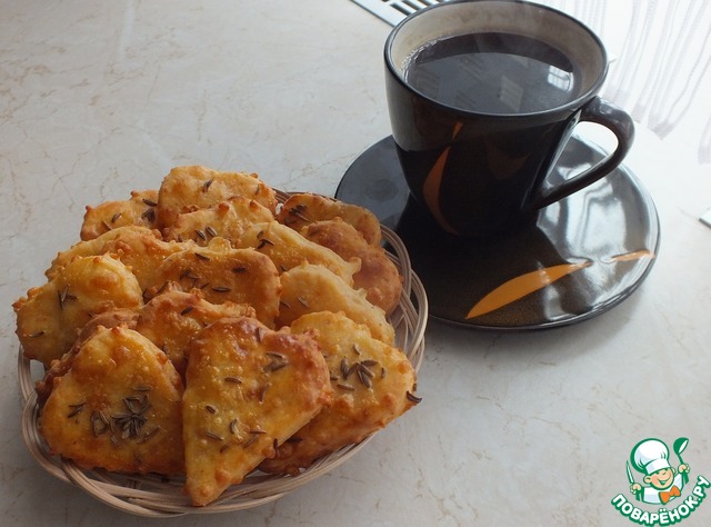 Печенье поместить на противень, застланный пекарской бумагой. Смазать печенье взбитым яйцом, посыпать тмином и отправить в разогретую до t180-190С духовку. Выпекать до золотистого цвета.
