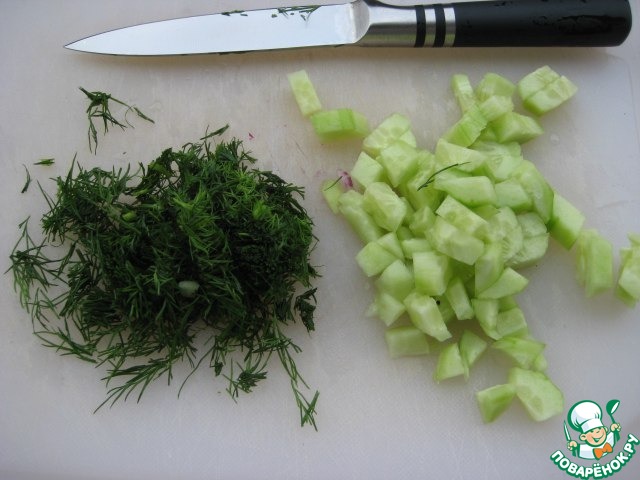 Огурец очистить от кожуры, нарезать кубиком. Измельчить укроп.