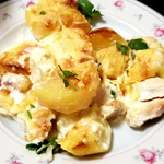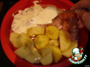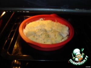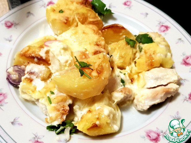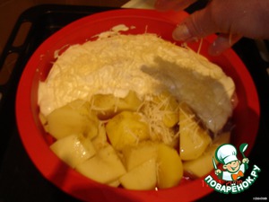 Положить в форму для запекания, разделив её пополам - на одну половинку картофель, а на другую - кусочки грудки. -
