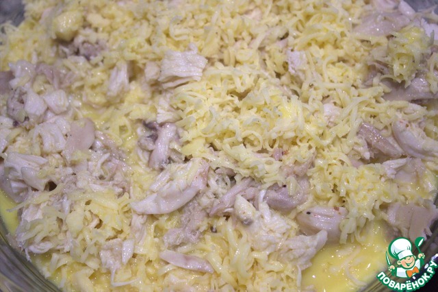 3/4 сыра перемешиваем с курицей, пробуем на соль. -