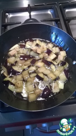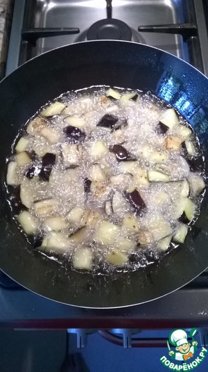 • Баклажаны моем и тут вы решайте сами по своему вкусу - чистить их или нет. Лично мне нравится вкус жаренной кожуры, поэтому я их не чищу. Режем баклажаны кубиками примерно 1х1 см и бросаем в кипящее масло.