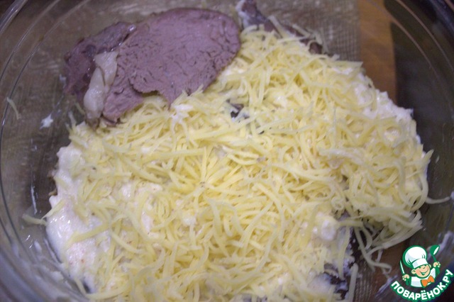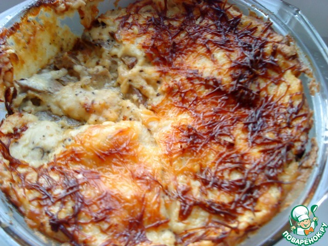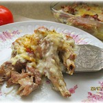 Если, как у меня, кусочками, то кусочки нарезать и выложить слоями. Мясо - бешамель - сыр - и так далее. У меня 2 слоя. -