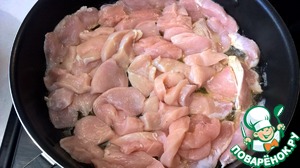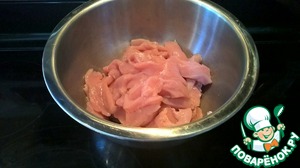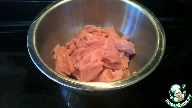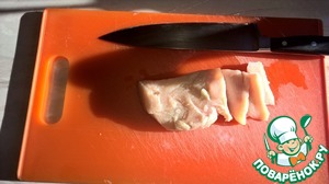Нарезаем куриные грудки тонкими ломтиками (5 мм)